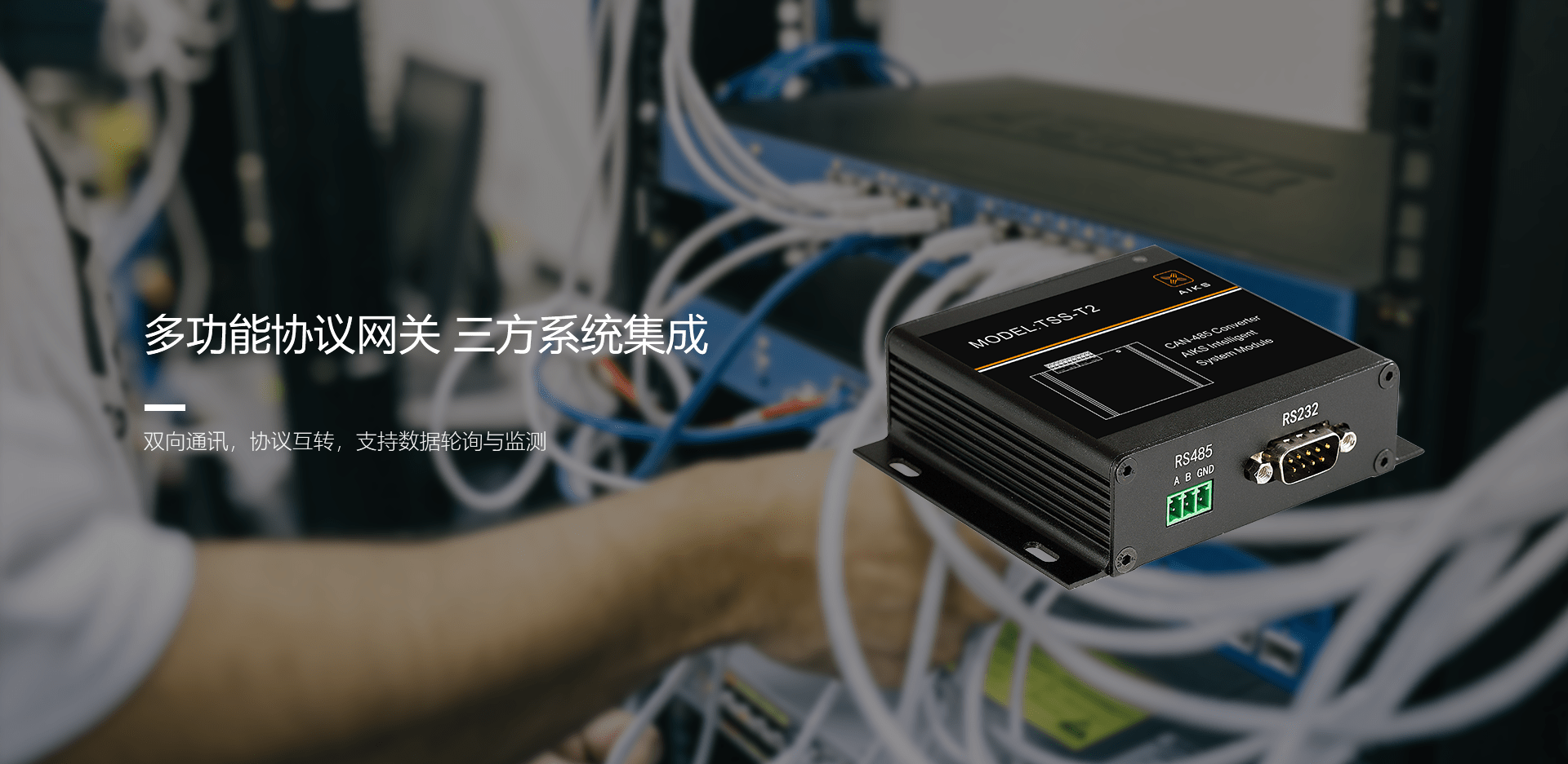 模块设定有一个RS232串口和一个484通讯接口,工作原理是将RS232或RS485信号转换为CAN总线信号在总线上传输,起到翻译员的作用,让设备与主机通信,控制连接设备。一般用于背景音乐、地暖面板、窗帘等485设备 .需要注意相同的485设备可以级联控制最多5个!
